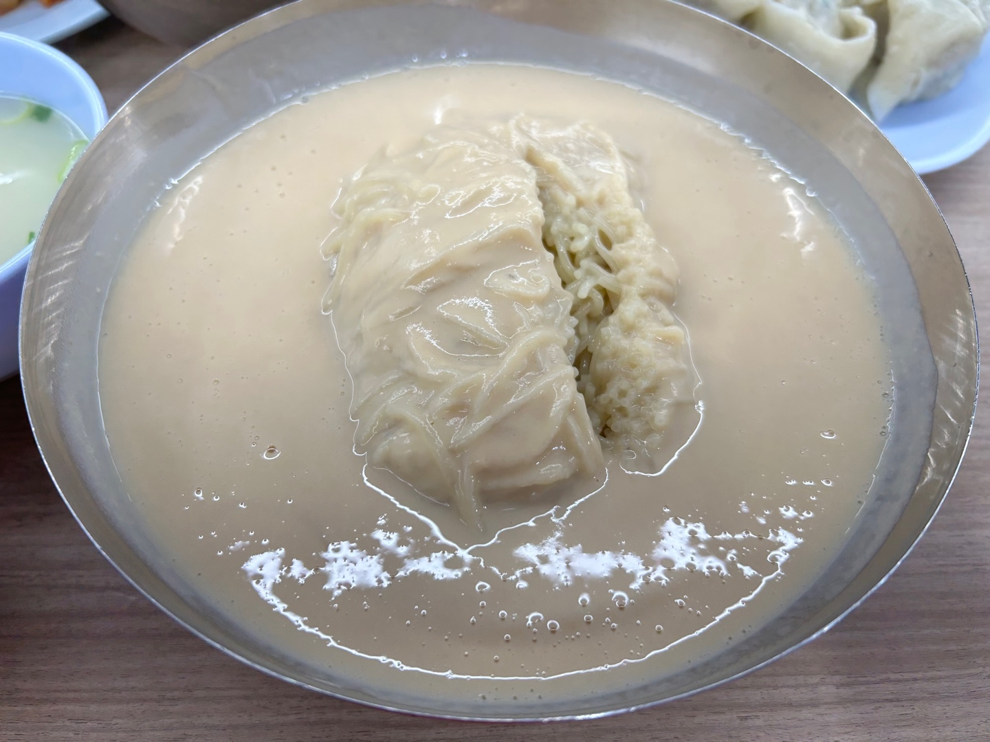 진주집 콩국수의 특징은 콩과 견과류를 함께 갈아 넣은 걸쭉한 느낌의 고소한 국물과 쫄깃한 면발입니다. 콩국수를 싫어하는 이들도 호불호가 갈리지 않습니다. 저도 콩국수를 별로 좋아하지 않았지만 이 집 콩국수는 정말 좋아합니다. 사실 진주집의 콩국수와 찰떡궁합은 김치입니다. 먹기 바빠서 김치사진을 깜빡했네요. 콩국수에 김치를 살포시 얹어서 먹으면 그야말로 금상첨화입니다.