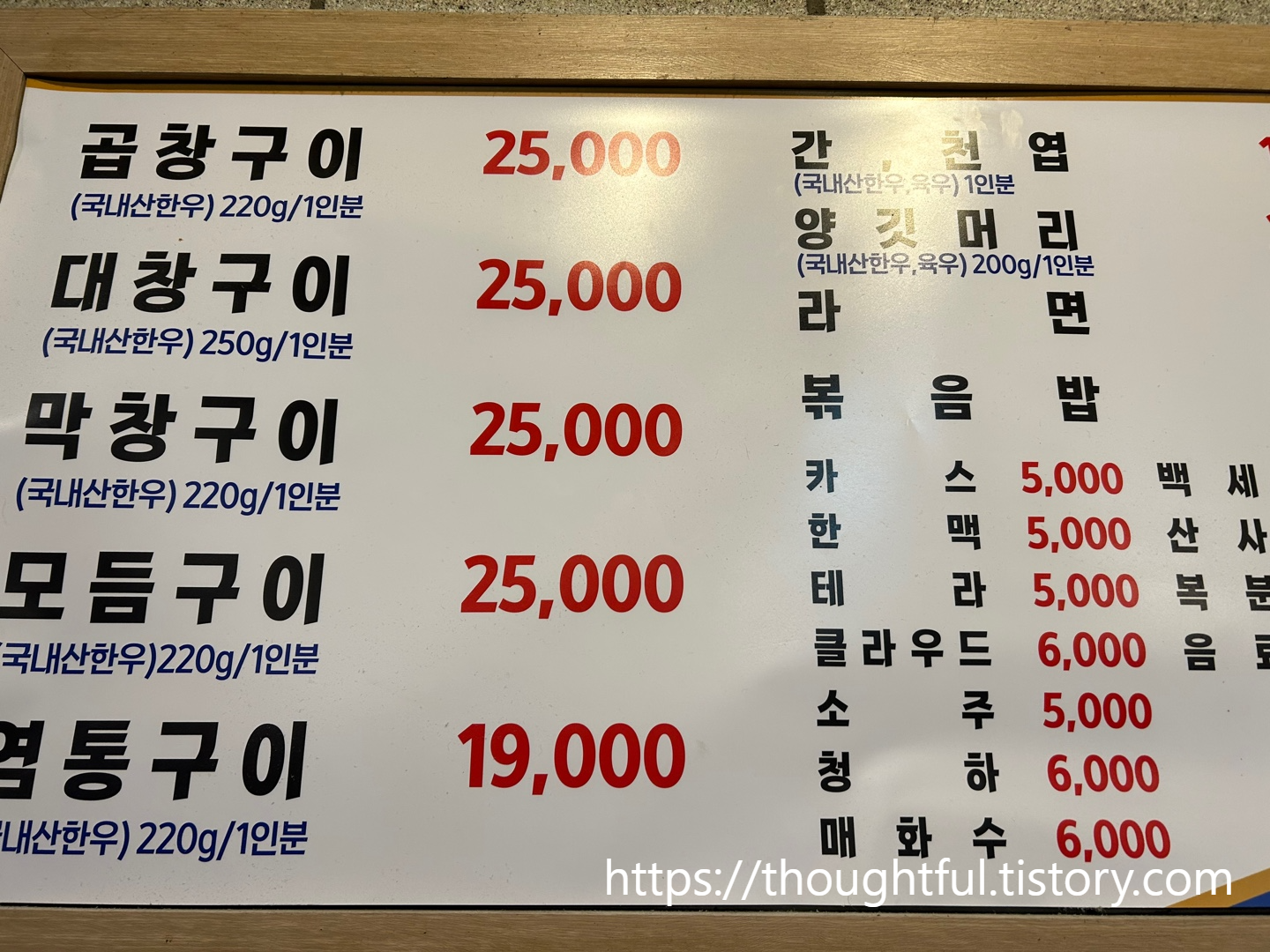 성원곱창은 소곱창 전문점이며, 대부분의 메뉴 가격은 동일합니다. 보통 성원곱창에 방문하면 무난하게 모둠으로 주문합니다. 이곳은 주문 후 애벌구이를 해서 나오기 때문에 주문하고 나오는데 시간이 다소 걸리는 편입니다. 그동안 맥주로 목을 축이고 있으면 됩니다.