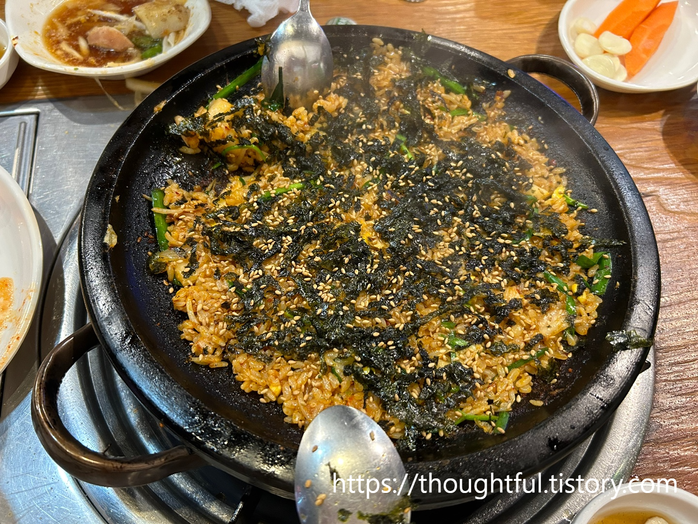 맥주가 정신없이 들어가는 와중에 곱창이 바닥을 드러냅니다. 여태 우리는 단백질을 먹었기 때문에 지금부터는 탄수화물의 시간입니다. 적절한 기름 배합과 양념이 어우러진 성원곱창의 볶음밥은 헛헛한 저의 배를 만족스럽게 채워줍니다.