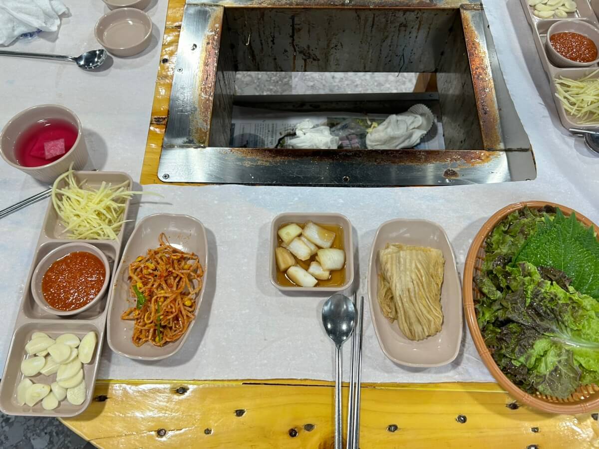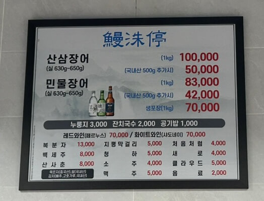 가격표가 먼 곳에 있어서 줌으로 당겨서 찍었습니다. 민물장어 1kg에 83,000원입니다. 1kg이라고 하면 장어 두 마리라고 생각하시면 됩니다. 참고로 저희 4인 가족이 먹었을 때, 1kg 에다가 500g 추가해서 먹었는데 양이 딱 맞았습니다. 이곳이 다 좋은데 찌개가 없어서 다소 아쉽습니다. 가게 중앙에 김치 콩나물 국을 무료로 제공하고 있지만, 아이들은 매워서 잘 먹지 못했습니다.