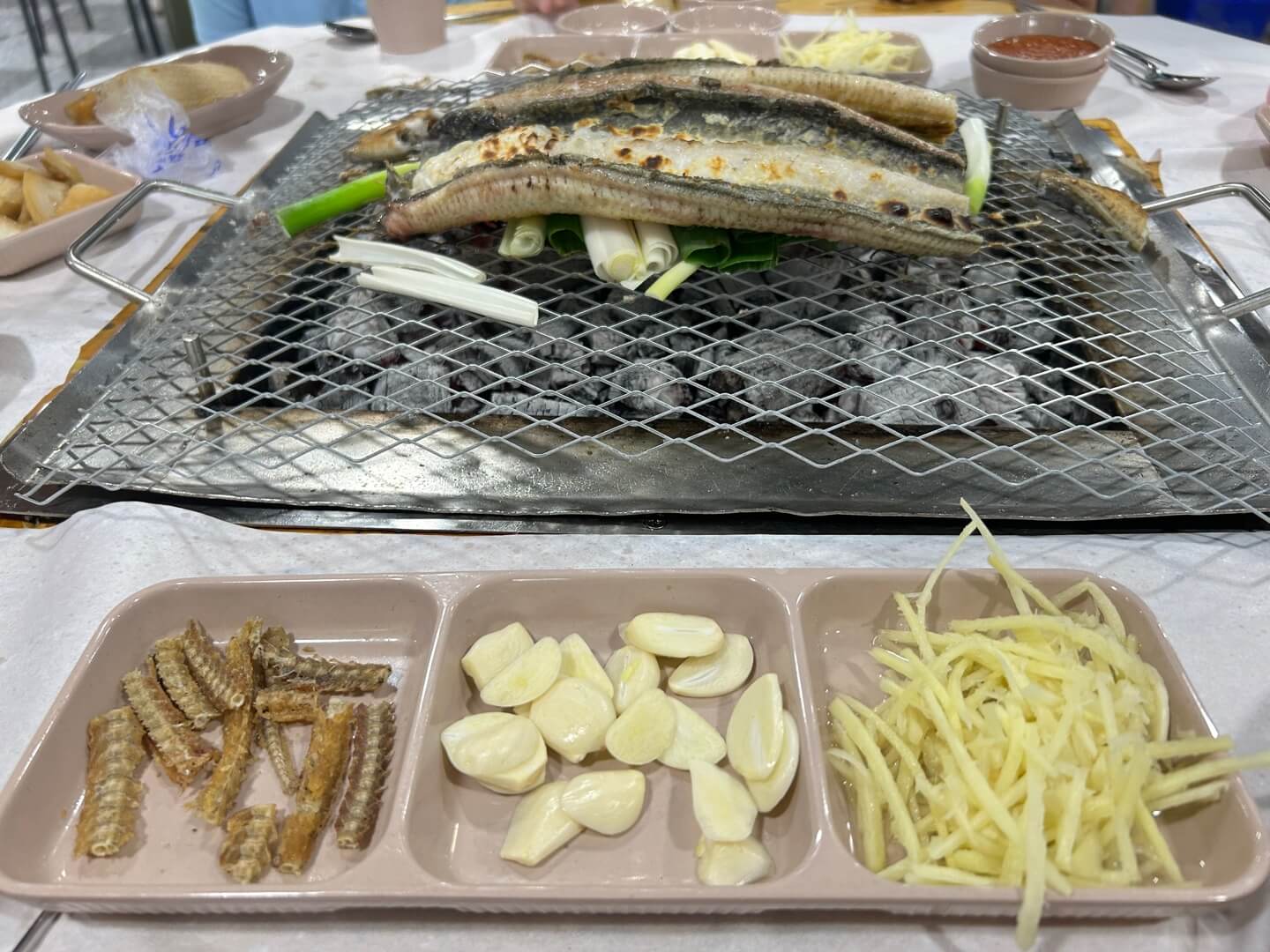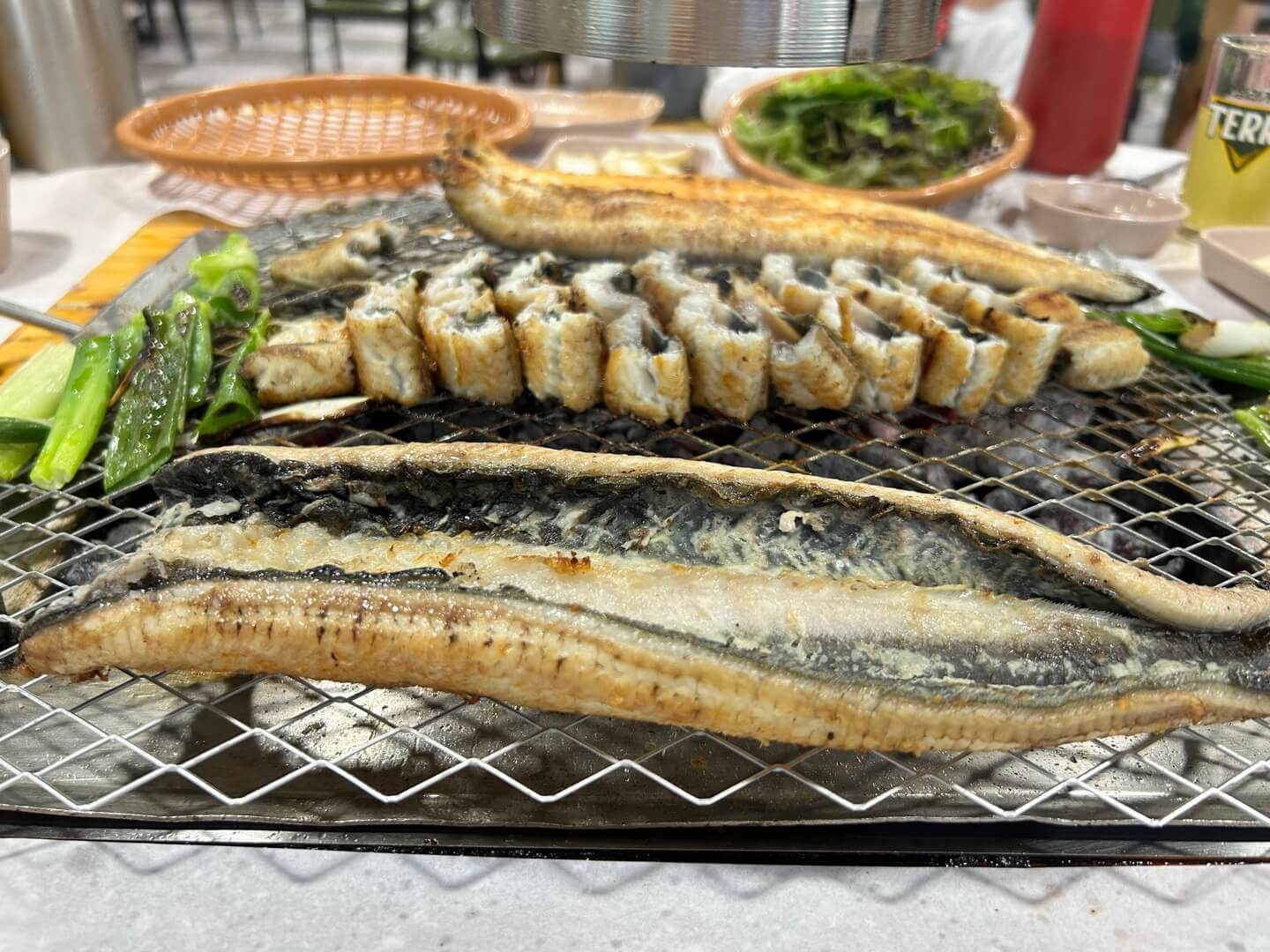 싱싱한 파 위에 올려진 장어는 앞뒤로 굽고 잘라서 세로로 세워서도 굽습니다. 다 구워지면 먹어도 된다는 신호를 주십니다. 그러면 그때부터 신나게 드시면 됩니다.