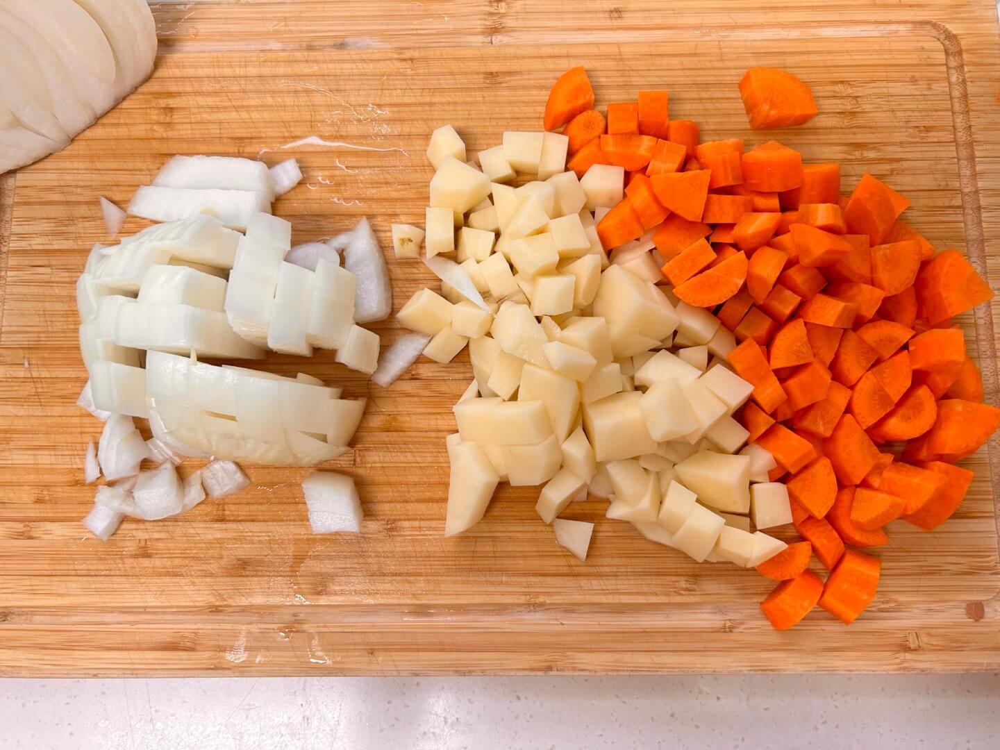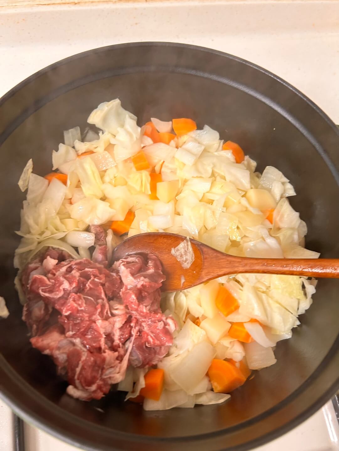 1. 감자와 소고기는 한 입 크기로 썰고, 양파와 양배추는 채를 썹니다.