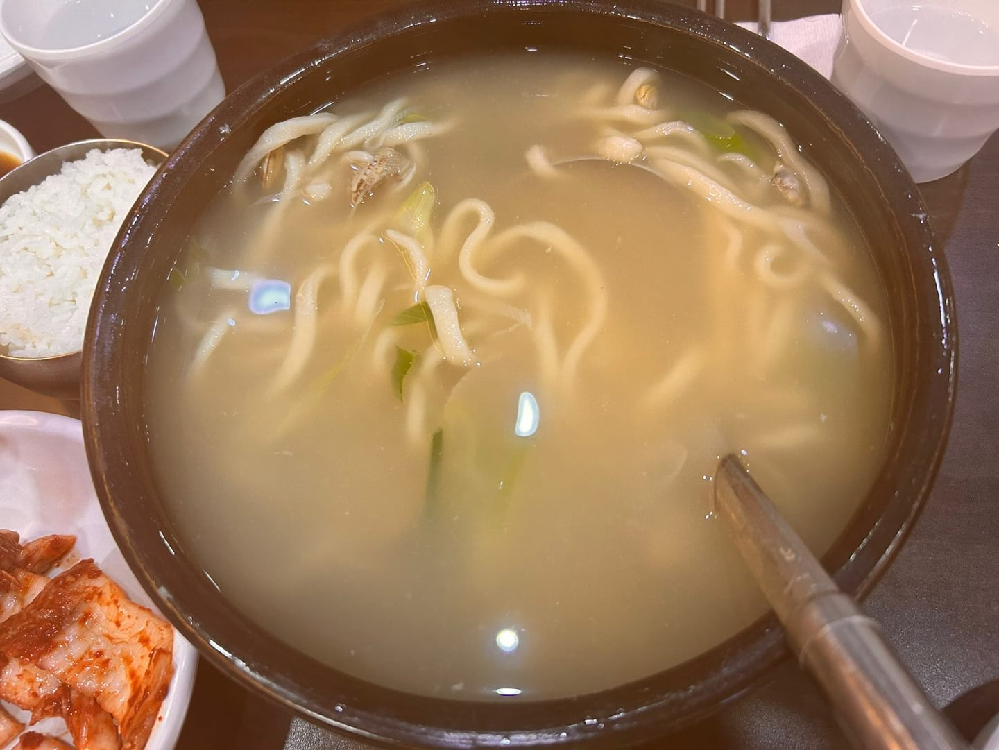 저희는 어른 3명에 아이 두 명이라 아구찜 소자에 바지락 칼국수를 시켰습니다. 기본으로 미역국이 나오는데 둘째가 맛있었던지 3그릇이나 뚝딱 비우더라고요. 함께 나온 김치도 맛이 있었습니다.