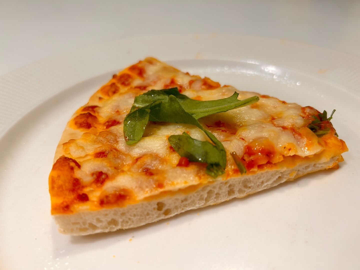 에어프라이기에서 7분 정도 조리 끝에 맛있는 피자가 완성되었습니다. 뭔가 허전해 보여서 집에 있는 루꼴라를 얹어서 먹었더니 훨씬 고급스러운 맛이 났습니다. 저는 부득이하게 큰 루꼴라를 사용했지만 새싹 루꼴라나 바질 등을 곁들여서 드셔도 어울릴 것 같다는 생각입니다.