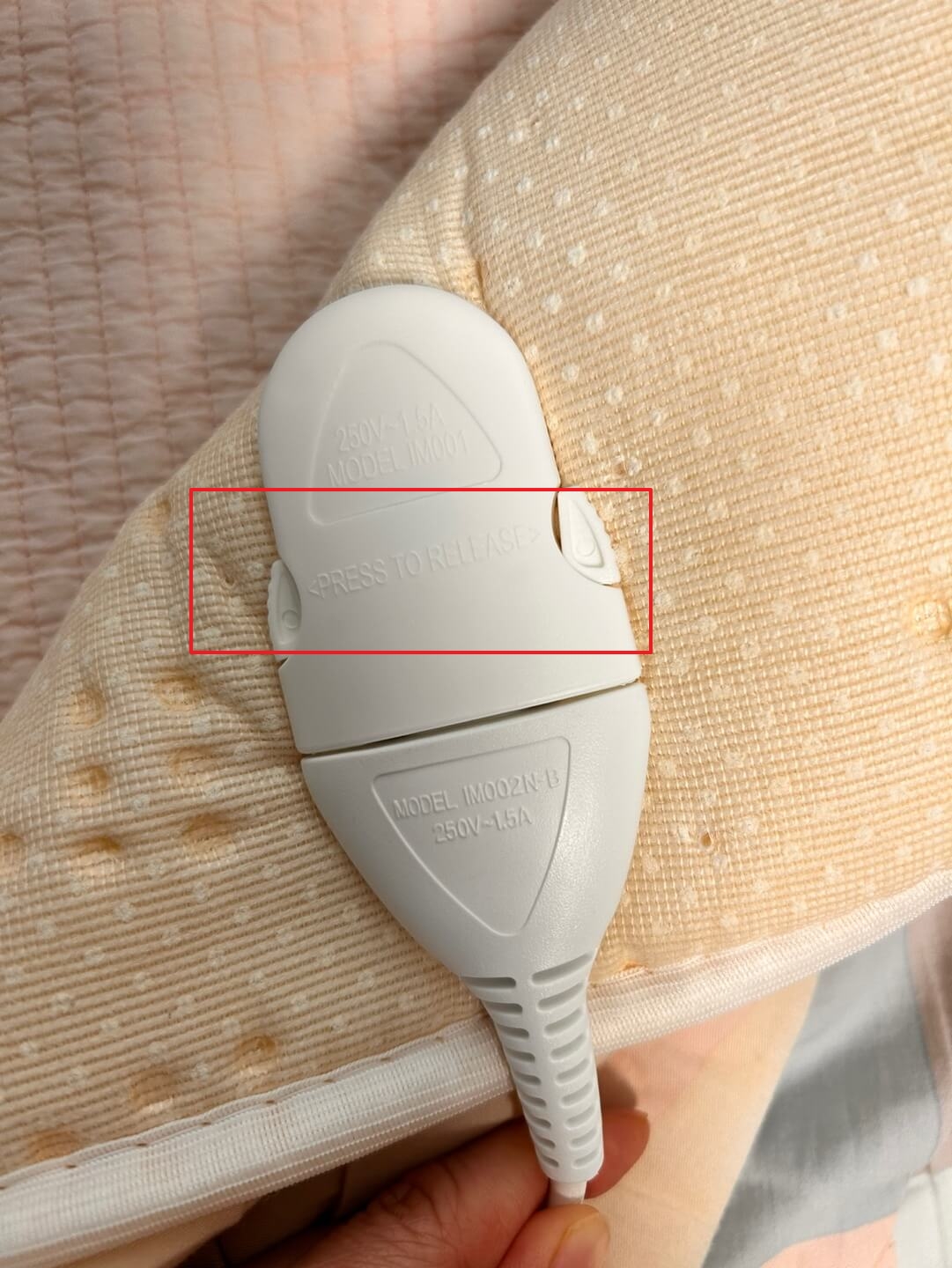 온도 조절기를 탈 부착할 때는 저 튀어나온 부분을 살짝 잡아주면 잘 빠진답니다. 세탁하실 때에는 온도조절기를 제거하신 뒤, 세탁하면 됩니다.