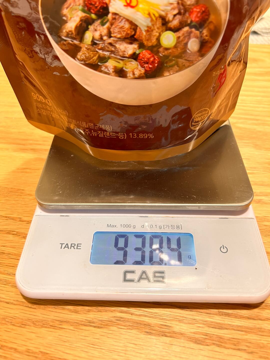 4. 푸짐한 국물의 양과 고기도 넉넉해서 3인분 정도 먹을 수 있습니다. 혹시나 해서 실제 중량을 재어 봤습니다. 포장에는 900g으로 되어 있는데, 실제로 재어보니 930g이 넘습니다. 고기만의 순수 무게도 115g입니다. 적은 양으로 보일 수도 있지만, 실제로 먹어보니 3인분 정도로 충분했습니다.