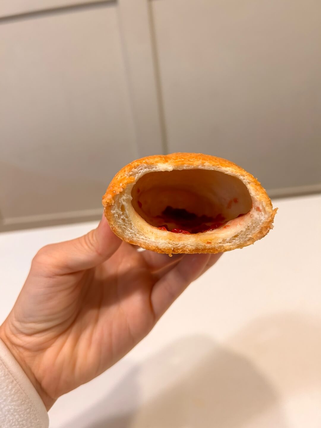 뻥 뚫린 가운데에 잼을 발라서 먹어도 좋고, 소시지를 넣어도 피자빵 같은 느낌일 것 같다는 생각이 들었습니다. 아이들에게는 소시지를 데쳐서 함께 먹으라고 주었더니 정말 맛있게 잘 먹었습니다.