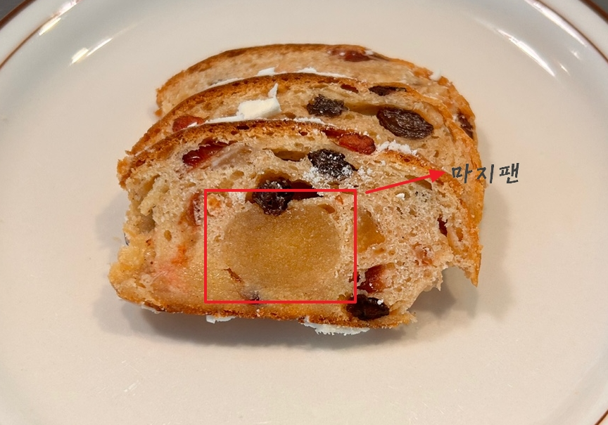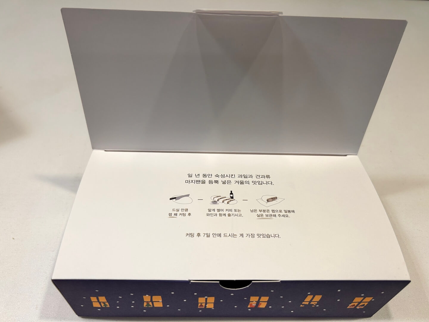 카드 뒤에는 또 한겹의 정성스러운 포장이 있습니다. 그 포장을 벗겨내면 드디어 오늘의 주인공인 슈톨렌이 모습을 드러냅니다. 슈톨렌은 중간부터 잘라서 먹고서 빵사이를 다시 붙여서 랩으로 밀봉해서 보관하시면 됩니다. 그러면 끝까지 맛있는 슈톨렌을 즐기실 수 있답니다.