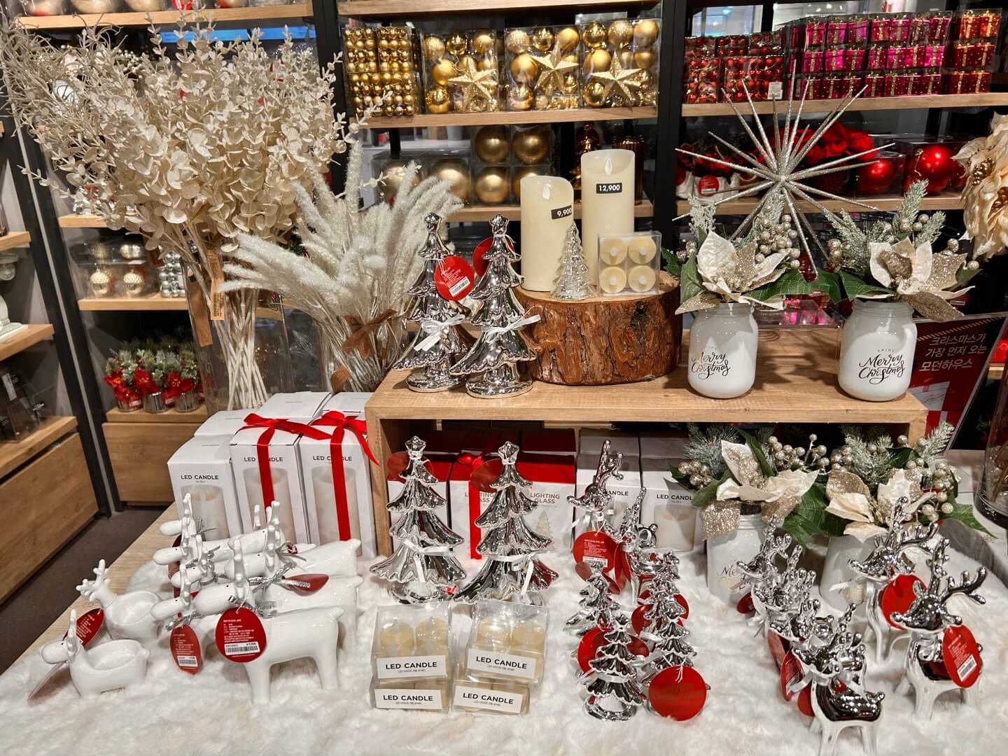 골드 색상의 트리와 미니 루돌푸도 인상적이었습니다. 함께 매치하면 좋은 조화 상품들도 근처에 같이 전시되어 있었습니다.