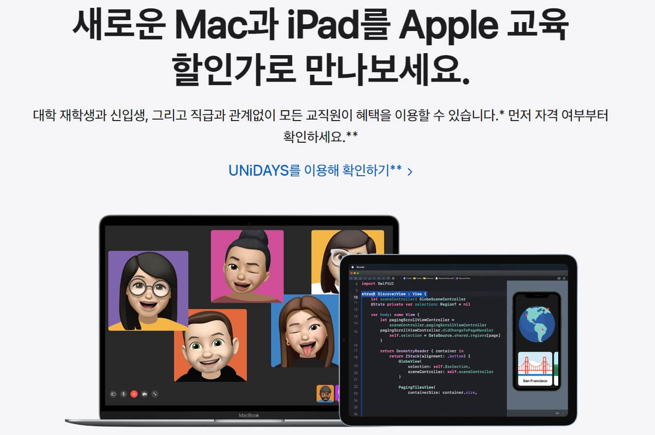 대학생과 교직원이신 분들을 위한 애플의 교육 할인 프로그램으로 구입하시려면 학교의 이메일이 필요합니다. 유니데이즈로 인증을 받으시면 애플의 제품을 최대 20% 할인받고 구매하실 수 있습니다. 하지만, 대부분의 분들은 학교 이메일이 없으시기 때문에 일부만 이 혜택을 누리실 수 있다는 게 단점입니다.
