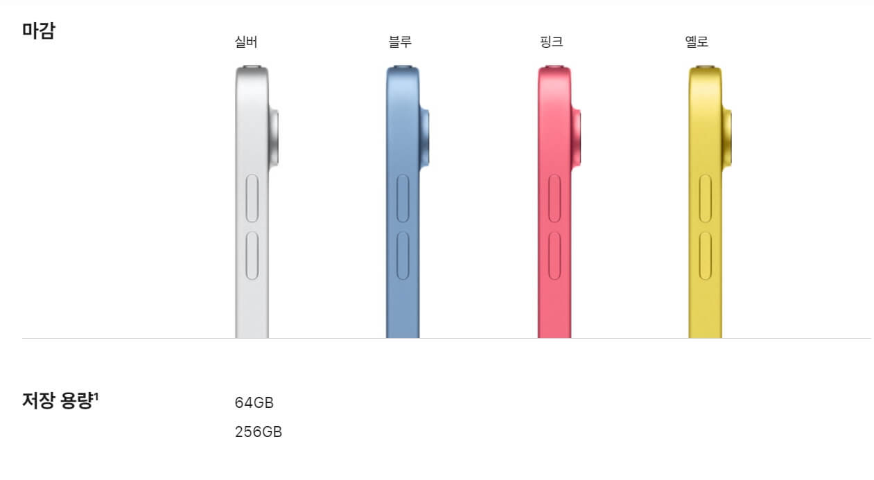 2022년도에 출시된 아이패드 10세대는 4가지 컬러의 옵션을 가지고 있으며, 64G와 256G 두 가지의 저장용량이 있습니다. 무게는 Wifi 제품 기준으로 477g입니다. 제품 사이즈는 247.6mmX179.5mm입니다. 가격은 256G Wifi 제품 기준으로 919,000원부터 시작합니다.