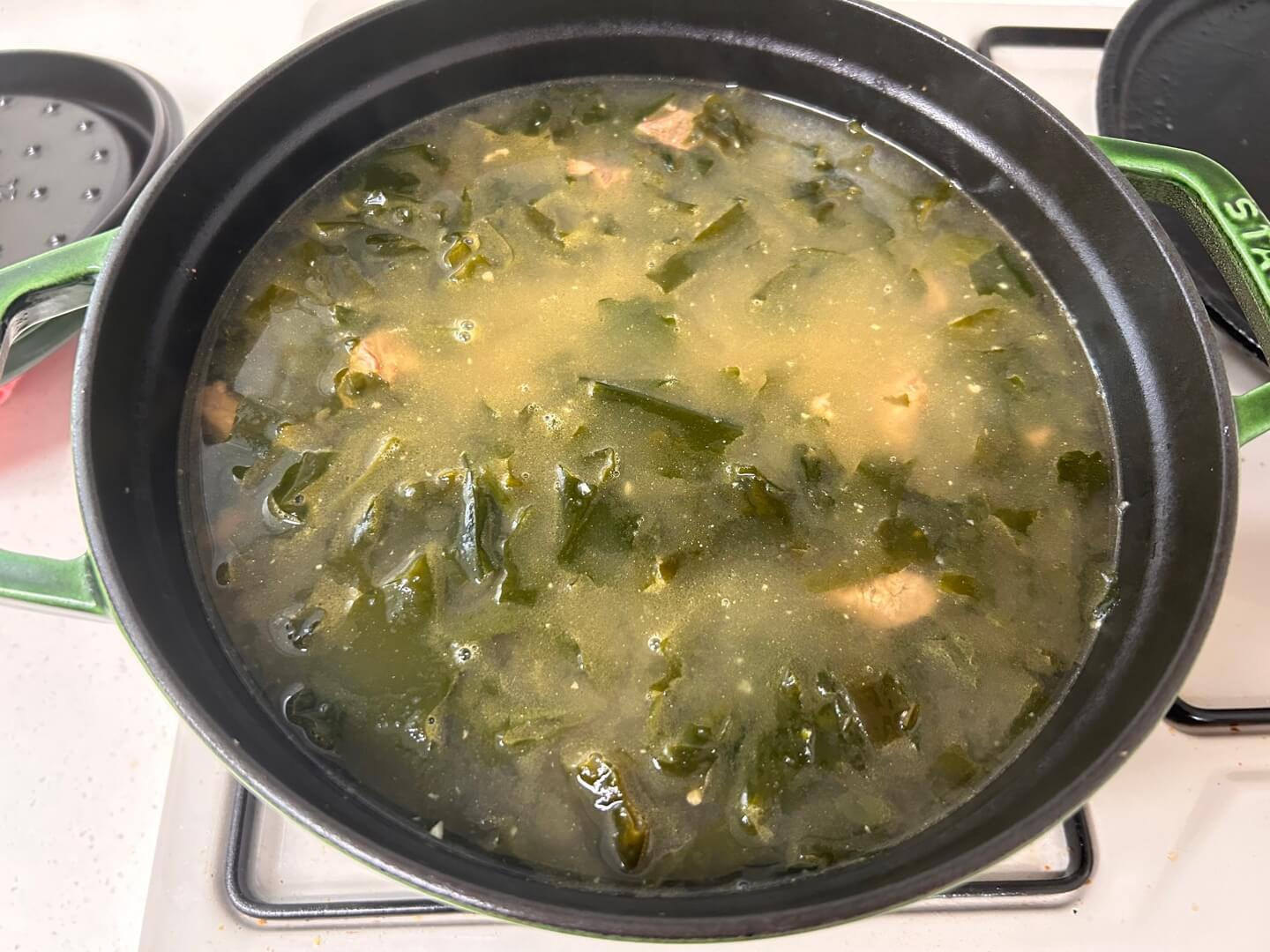 30분 정도 끓이면 오른쪽 사진처럼 미역이 다소 풀어져 있는데요.