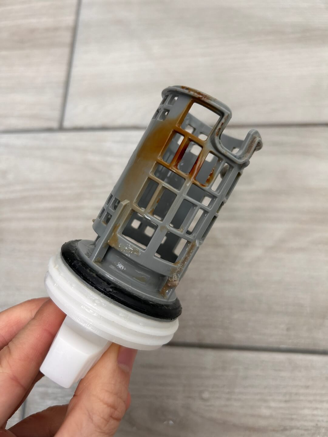 배수 호수에 고인 물을 빼주고 배수펌프를 열어서 이물질을 제거해 줍니다. 철 성분이 들어간 이물질이 오래 있다보면 사진처럼 이염되는 경우가 있으니 바로바로 제거해 주시는 것이 좋습니다.