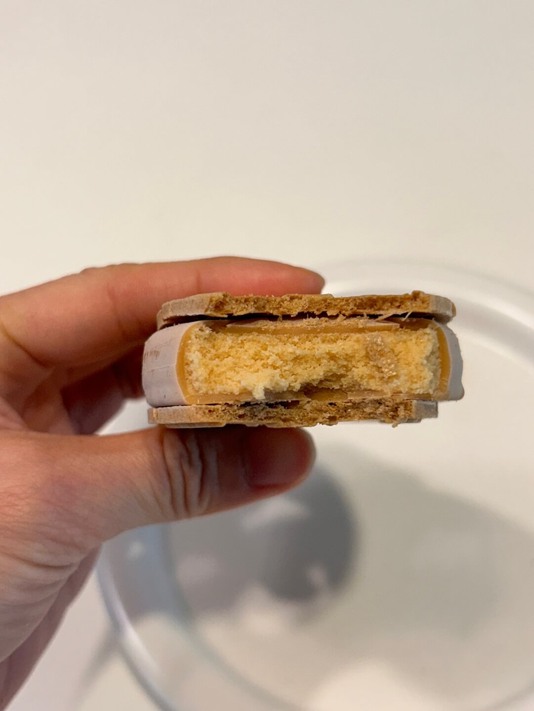 크리스피 샌드위치의 양면은 이처럼 웨이퍼가 감싸고 있고, 그 가운데에는 카라멜로 코팅된 아이스크림이 자리 잡고 있습니다.
