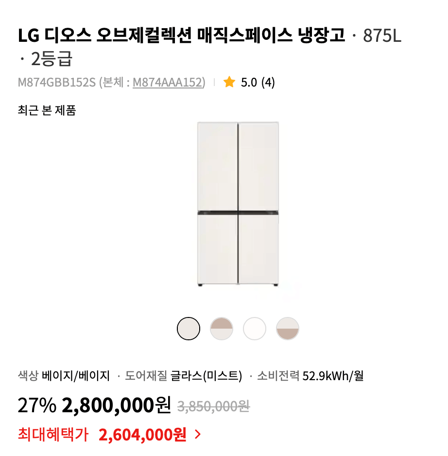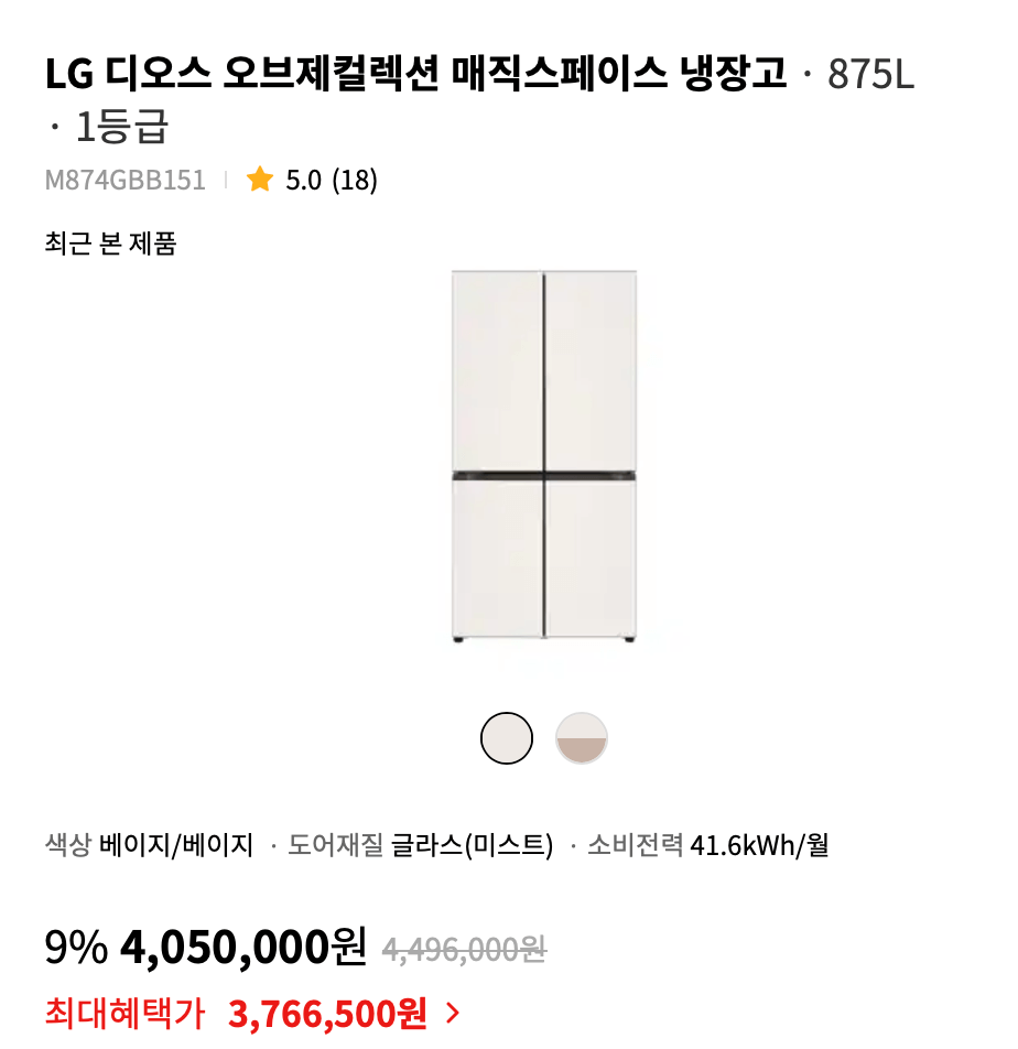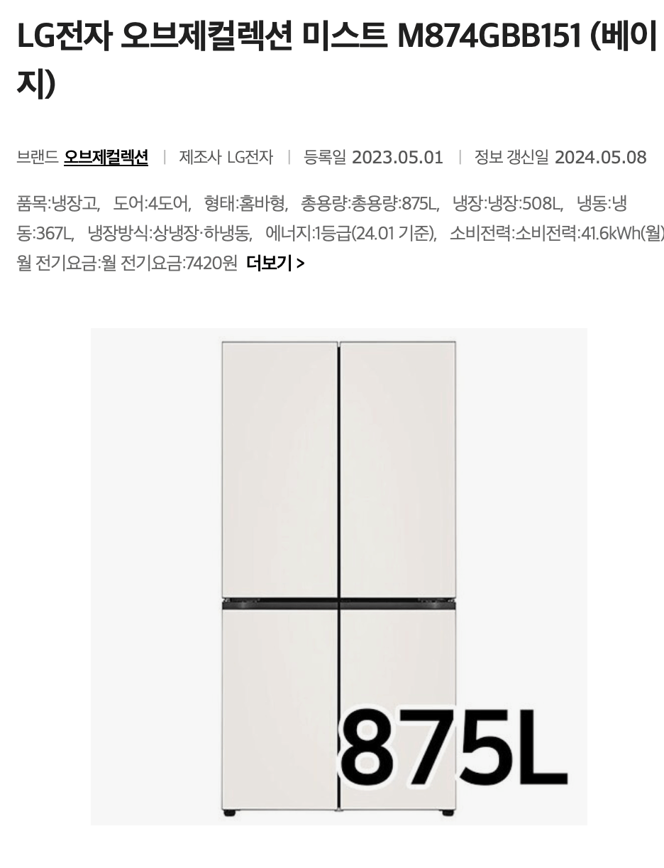 LG 디오스 오브제컬렉션 (고효율) 냉장고 M874GBB0M1S은 870리터(L) 오브제컬렉션 베이지 베이지 색상의 냉장고로 24시간 신선함을 유지합니다. 상냉장 하냉동 타입으로 더욱 편리하고 실용적인 LG 냉