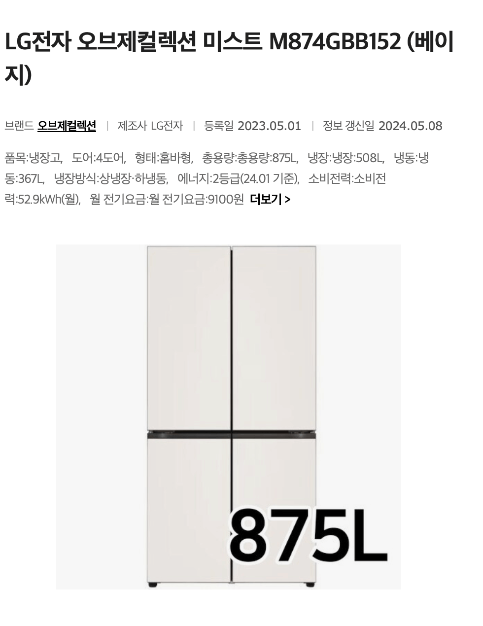 LG 디오스 오브제컬렉션 (고효율) 냉장고 870리터(L) 오브제컬렉션 베이지 베이지 | M874GBB0M1S | 냉장