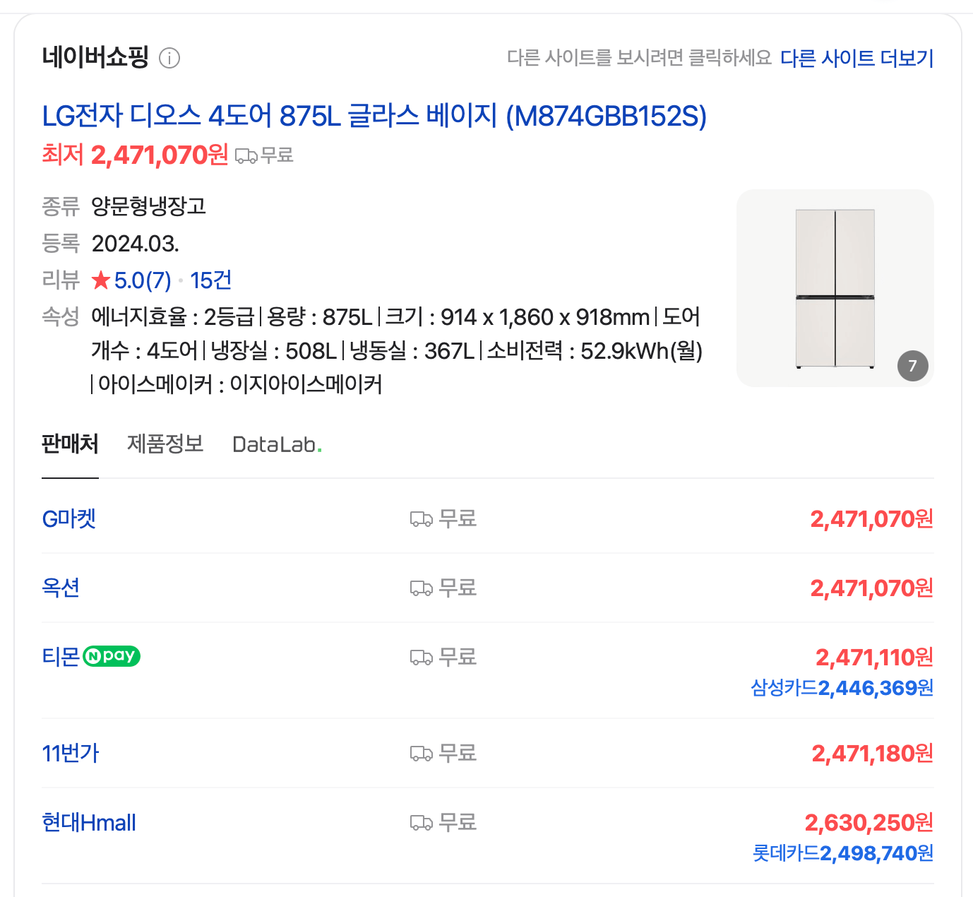 자 이제 냉장고를 골랐으면, 가격비교를 하러 가봅니다. 대부분의 포털에서는 모델명을 치면 최저가 검색이 가능합니다.
