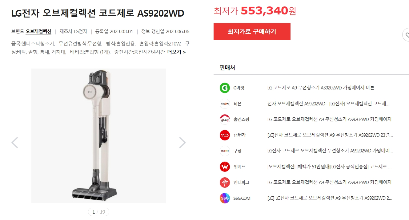 다음쇼핑에서 검색한 결과 LG 코드제로 A9 무선청소기 제품이 50만 원 중반 대에 판매 중입니다. 구매하실 분들은 참고하시기 바랍니다.