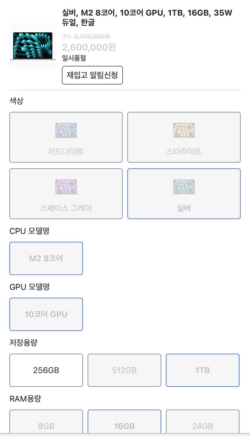 맥북 에어 M2 제품이 품절인 이유는 그 후속작인 M3 제품이 출시되었기 때문입니다. M2와 M3의 차이는 8GB 와 16GB 차이 정도라고 보시면 되는데요. 그렇게 따졌을 때 같은 사양의 M3제품이 바로 아래의 상품입니다. 쿠팡에서는 220만 원 정도 하네요. 코스트코와 비교했을 때 약 30만 원가량 차이가 납니다.