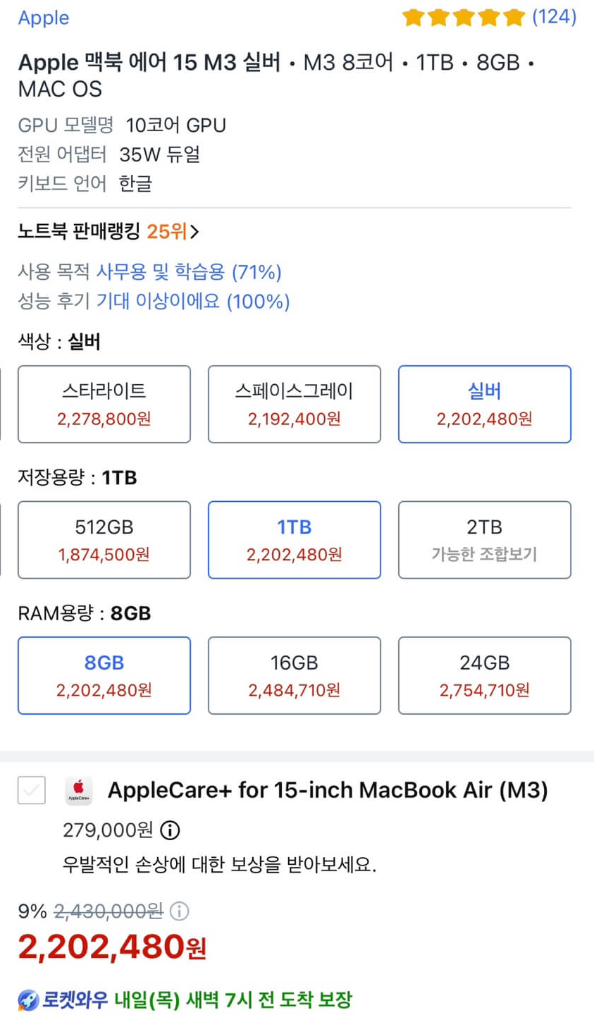 맥북에어 15 M2 8GB 512GB 제품의 가격은 160만원대 초반입니다. 사실 제가 4개월 전에 맥북 프로를 샀는데요. 이 사양과 거의 비슷하고 M2가 M3 란 것 외에는 다른 게 없는데, 제가 샀던 가격은 무려 207만 원입니다. 이 가격도 세일받은 금액입니다.