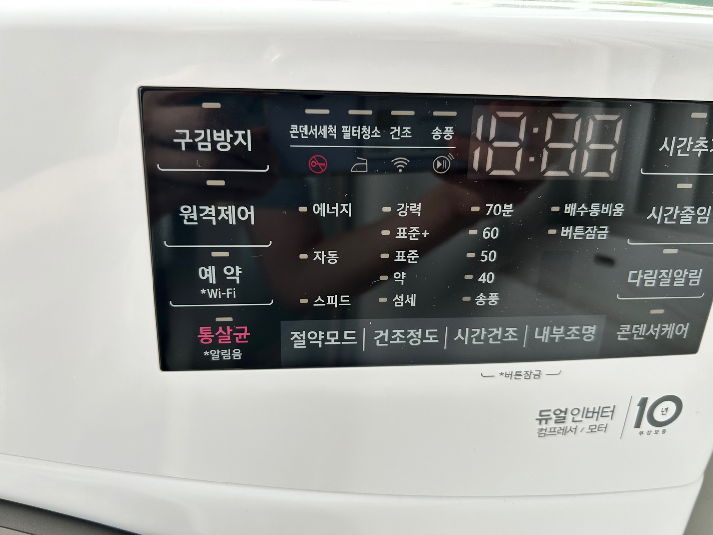 보통 일반 표준으로 놓고 돌리면 큰 수건이나 옷 끝자락이 덜 마른 느낌이 나기 때문에 표준+로 놓고 시간을 약간 추가하는 편입니다. 그리고 외출 시를 대비하여 구김방지 버튼을 꼭 누릅니다.