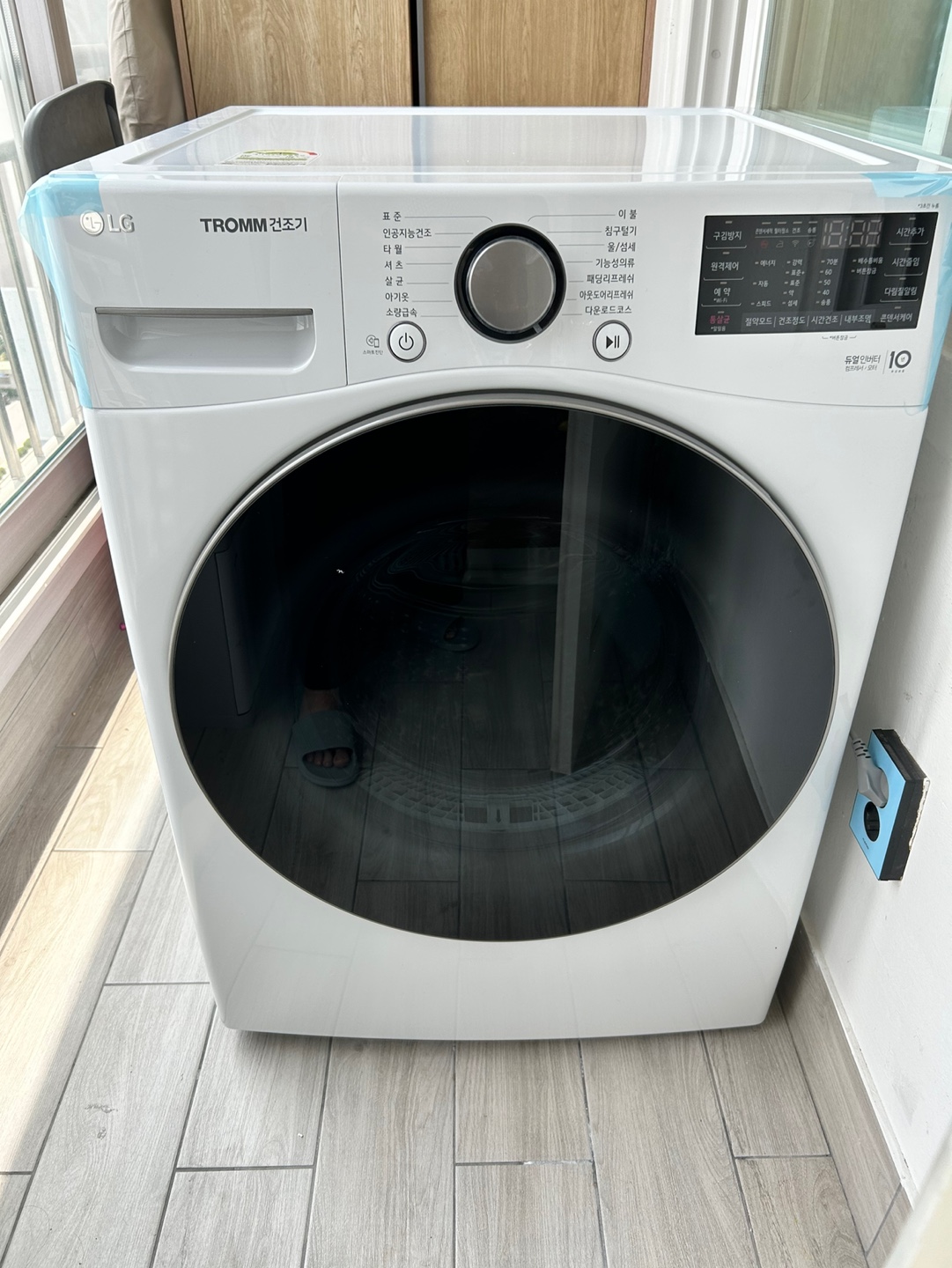 구매 후 3일 후에 바로 배송이 오게 됩니다. 맨처음 거대한 박스의 크기에 놀라고, 설치장소가 앞베란다였기에, 창문을 뜯고 이 거대한 건조기를 들여놓게 됩니다. 부득이하게 문을 마주 보고 설치를 하게 되었는데, 직접 사용해 보니 매우 만족스럽습니다.