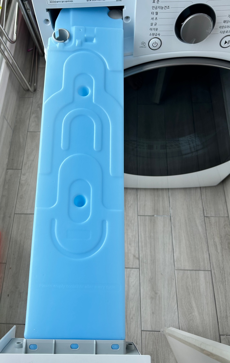 앞베란다에는 배수구가 없기 때문에 물통을 비워가며 사용할 수 밖에 없는데, 보통 빨래를 2번 할 때마다 갈아주고 있습니다. 꽤 무겁고 길쭉해서 들고 가기 약간 번거로움이 있습니다.(수평을 잘 맞추지 못하면 물을 흘리기도 합니다.)